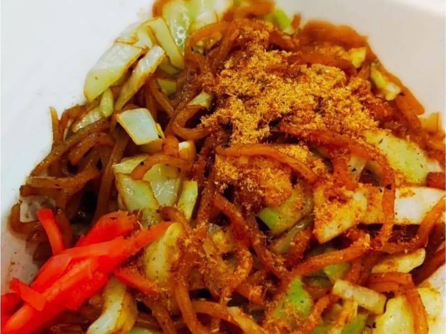 This is a famous dish from Fujinomiya, made with chewy, firm steamed noodles, meat flakes, and cherry shrimp from Shizuoka Prefecture, stir-fried with cabbage and bean sprouts in a sauce, and topped with plenty of shredded sardines.